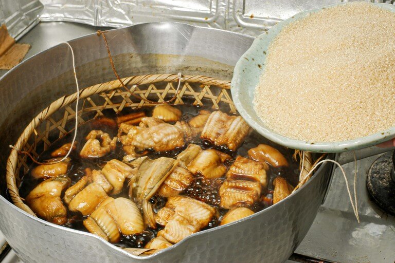 煮立ってきたら弱火に落とし、5分ほど経ったらザラメを加える。途中で煮汁が少なくなったら醤油を継ぎ足し、さらに20〜25分間煮続ける。