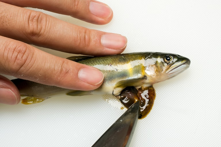 アユはフンを絞り出した後、腹を割って内臓を取り除き、水洗いして水気をふき取る。