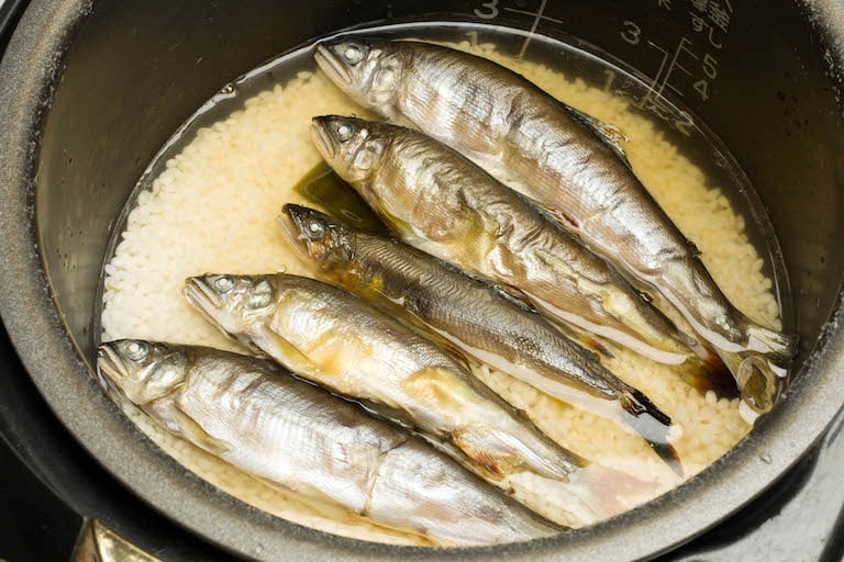 炊飯器の指定に合わせて炊き上げたら蓋を開けず、10分ほど蒸らしてからアユを取り出す。