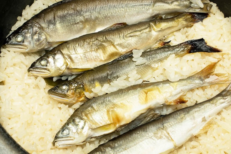アユは炊き込みご飯にしても美味しい。上品な白身とだしで炊くご飯の組み合わせにアユの香りが加わり、食欲が刺激されついお代わりしたくなる。