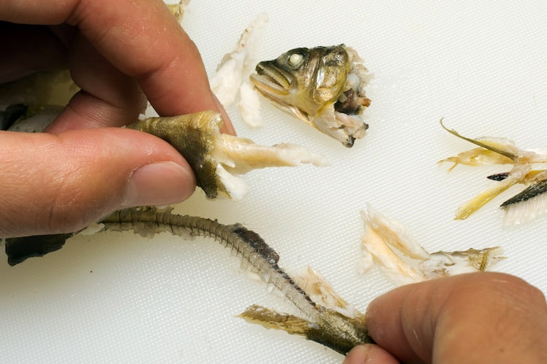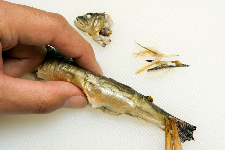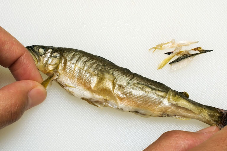 すると身から中骨が抜ける。若アユや小さなアユは小骨が柔らかく腹骨も気にならないのでそのままでもよいが、シーズン後半のアユや大きなアユの場合は骨が硬くなるので腹骨を取り除いたほうがよい。さらに適度な大きさにほぐした身は、炊飯器に戻して約5分間温め、青ネギの小口切りを散らしてざっくりと混ぜ合わせれば炊き込みご飯の出来上がり。