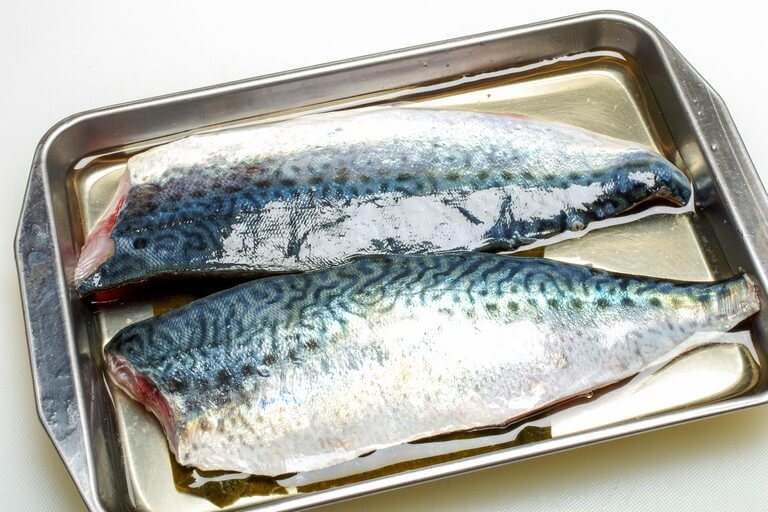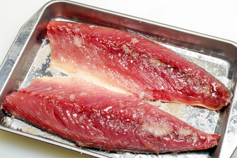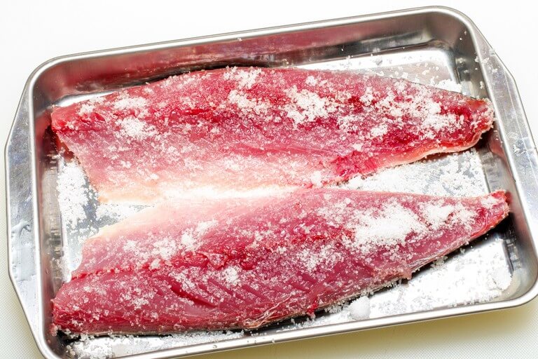 おろした身をバットに並べ、皮と身の両面に多めに粗塩を振る。