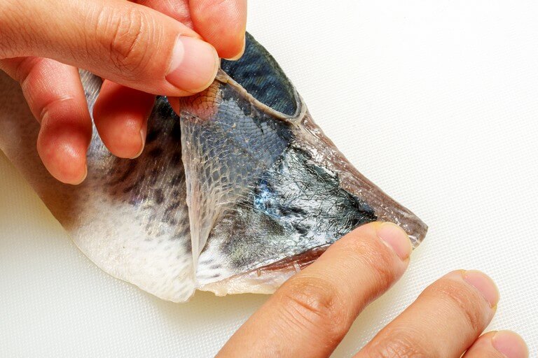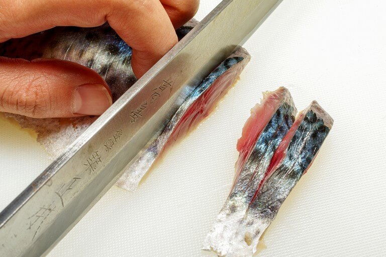 酢締めが終わったら酢をさっとふき取り、骨抜きで背身と腹身の接合部に並ぶ血合骨を1本1本残さず抜き取る。