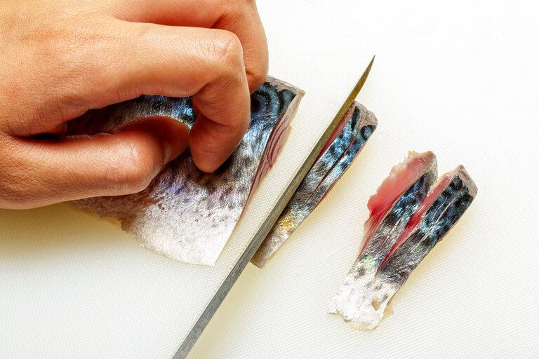 締めサバを作るには40cm前後の大型サイズがよく、ウロコを落として基本の3枚おろしにしたら腹骨をすき取る。