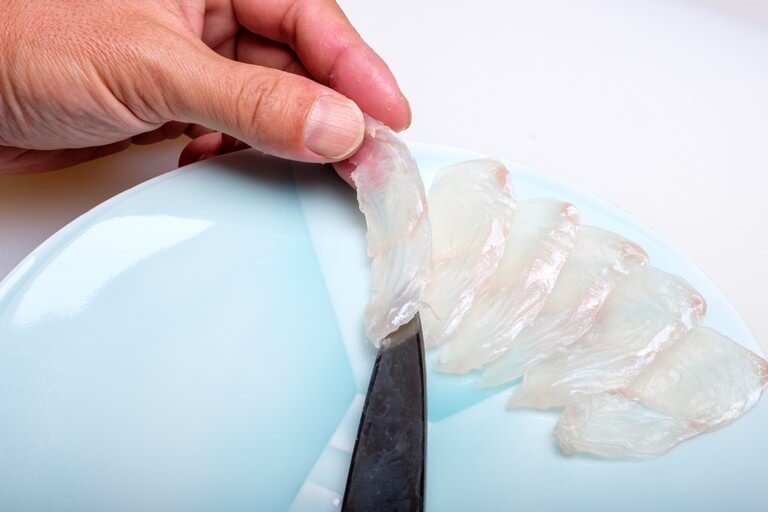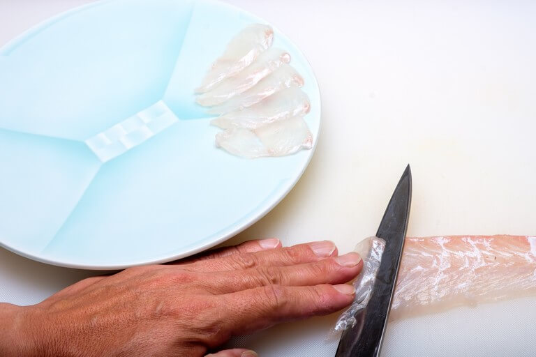 旨味と歯応えのある新鮮なヒラメは、薄造りが定番。付けダレはポン酢が合う。きれいな薄造りをするには、柳刃包丁がやはり便利。1本あると、さまざまな刺身に使える。