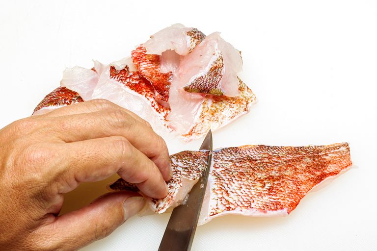ウロコを落とし3枚におろした身は血合骨を処理し、皮付きのまま厚さ1~1.5cmのそぎ切りに切り分ける。