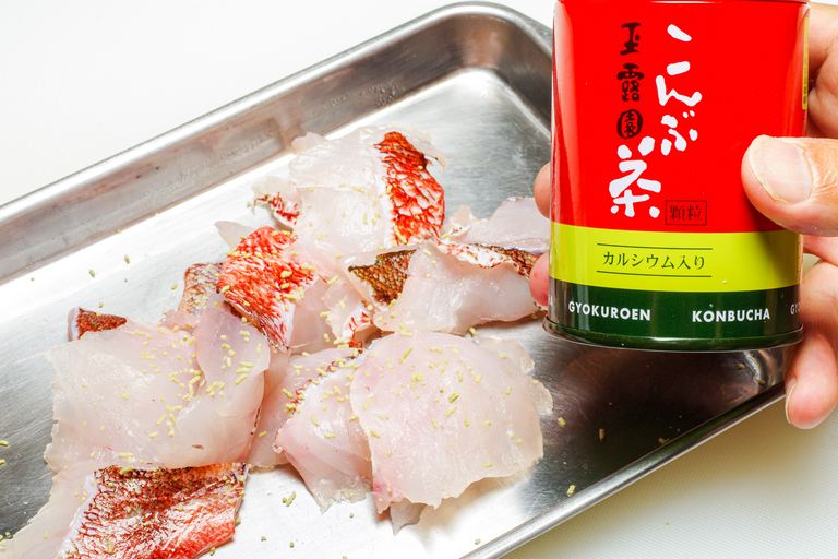 味付けは昆布茶のみ。半身に対して小さじ4分の1を目安とし、軽くもみ込んでおく。