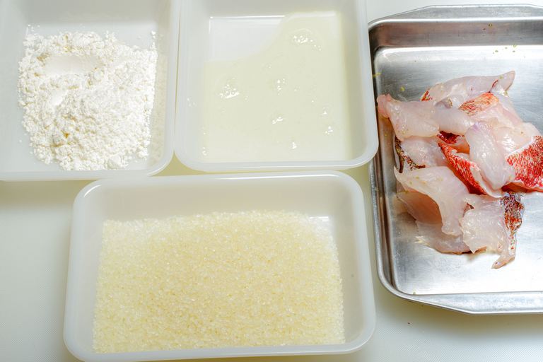 揚げ衣は小麦粉、溶いた卵白の順で、最後の道明寺粉は軽く圧迫してしっかりと付けること。