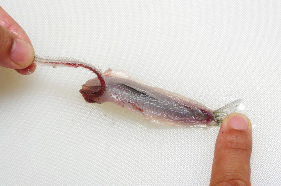 さらに中骨を取り除く場合は、まず指先で尾の付け根部分の中骨を折る。