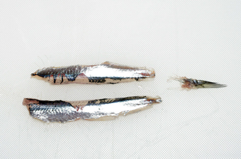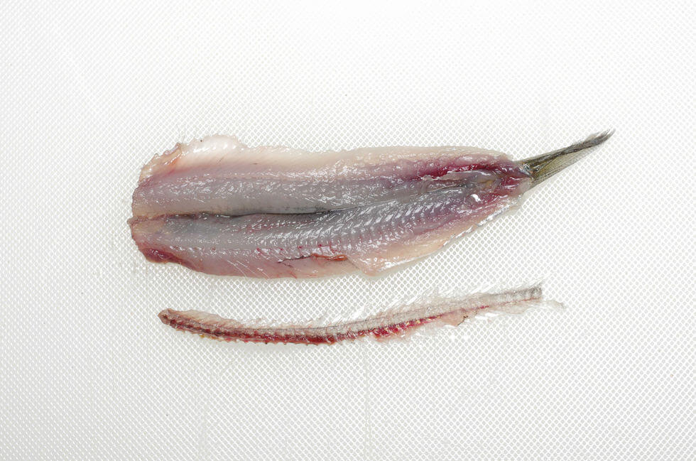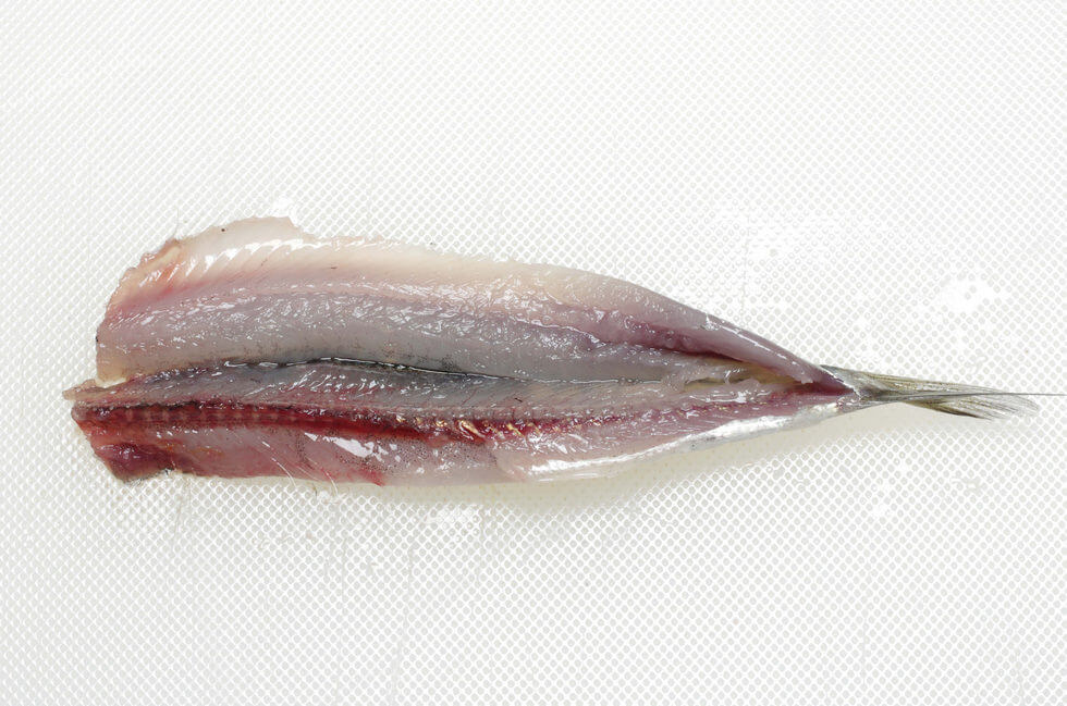 切り口から片身2枚に割けば刺し身の完成。なお、細く軟らかいカタクチイワシの腹骨はそのまま刺し身で食べられる。