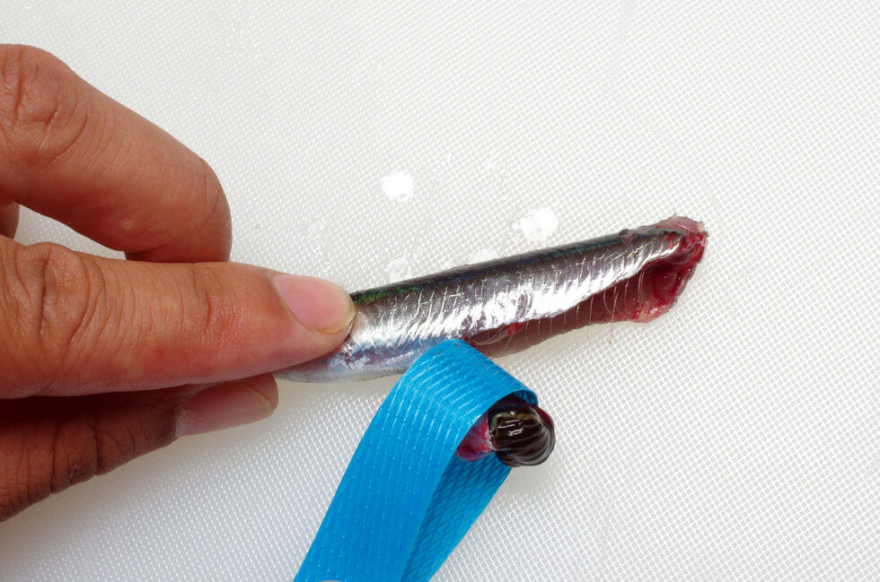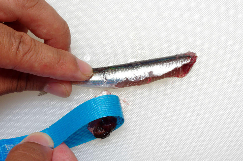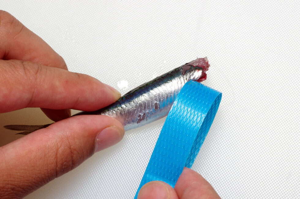 カタクチイワシの小さく柔らかな内臓を取り除くには、梱包用の「PPバンド」を輪にして根もとをホチキスで留めたものを利用するのがおすすめ。