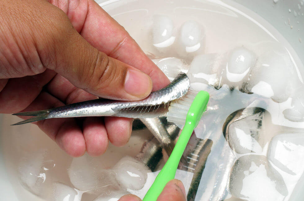 最後に腹内に残った血ワタなどの汚れを歯ブラシで優しく掃除するが、この時、イワシの身が温まらないように冷たい氷水の中で作業する。水気を拭き取れば下処理は終了。