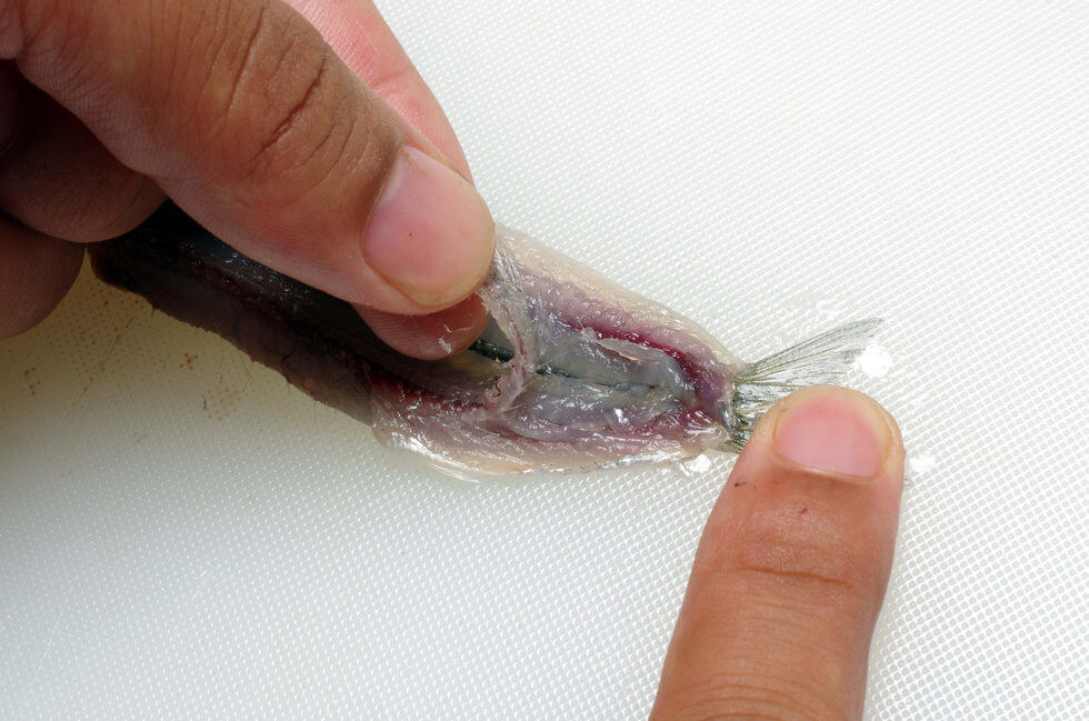 刺し身で食べる時は、背ビレをつまみ、頭の切り口に向かって引っ張って外す。
