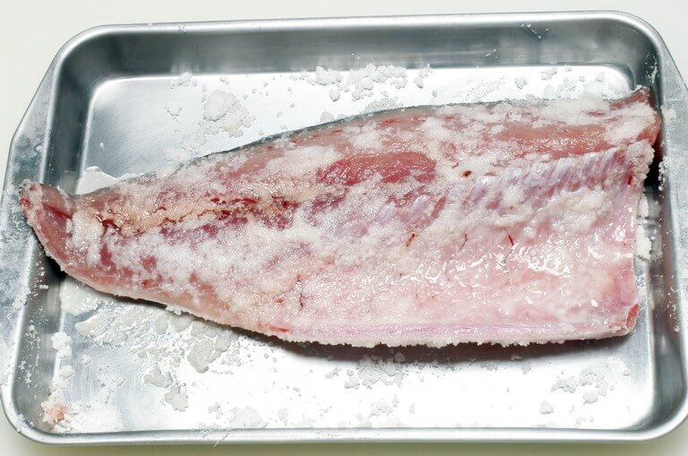 基本通り3枚におろしたサバは、皮と身の両面を覆い隠すように、たっぷりと粗塩を振り、1時間~1時間半締める。