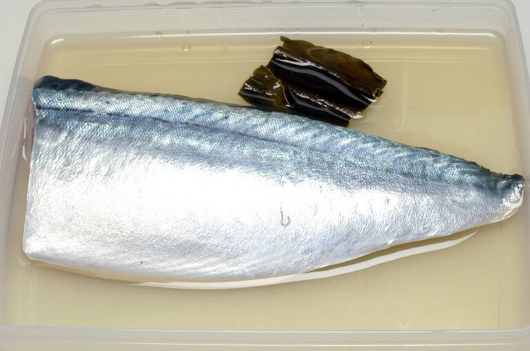 塩締めを終えたサバは、流水で塩を洗い、さらに水臭くならないように酢洗いを行なう。サバの身をバットに移し替え、米酢を半分浸るくらいに注ぎ、5cm角程度の昆布を足す。途中で裏返して約1時間、酢締めにする。
