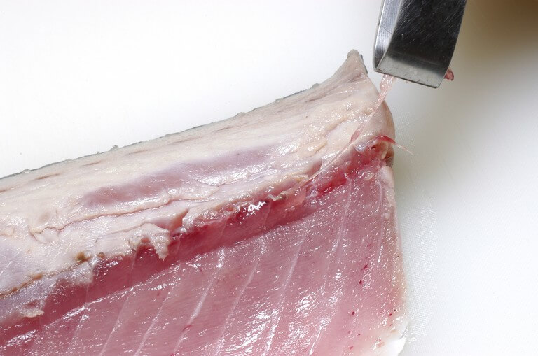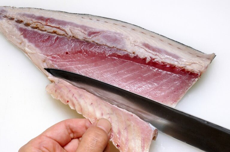 続いて、背身と腹身の接合部に並ぶ血合骨を抜き取る。この時、頭の切り口にある血合骨を残さないこと。