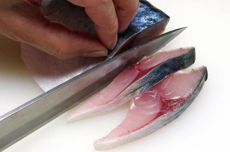 酢締めしたサバは酢を軽くふき取った後、腹骨をすき取る。