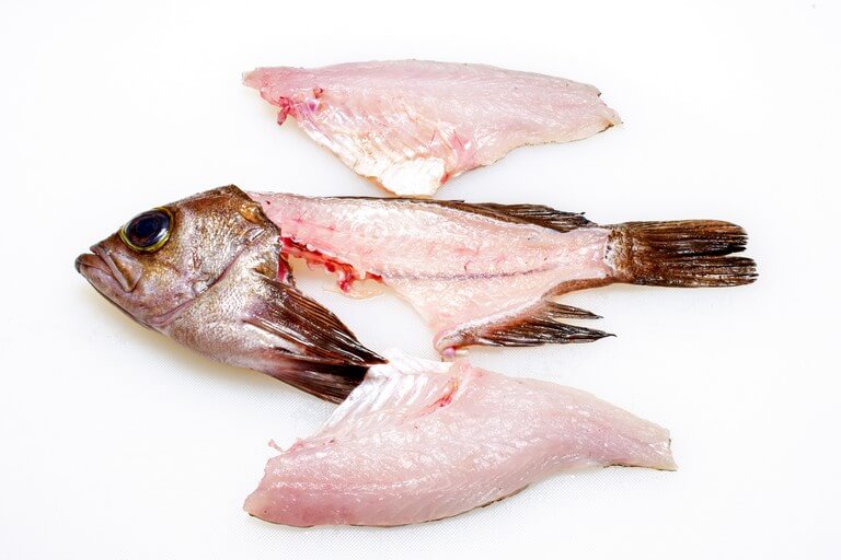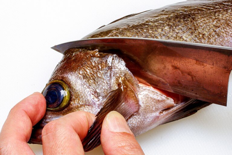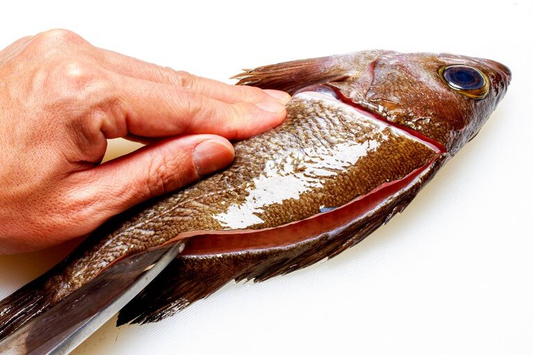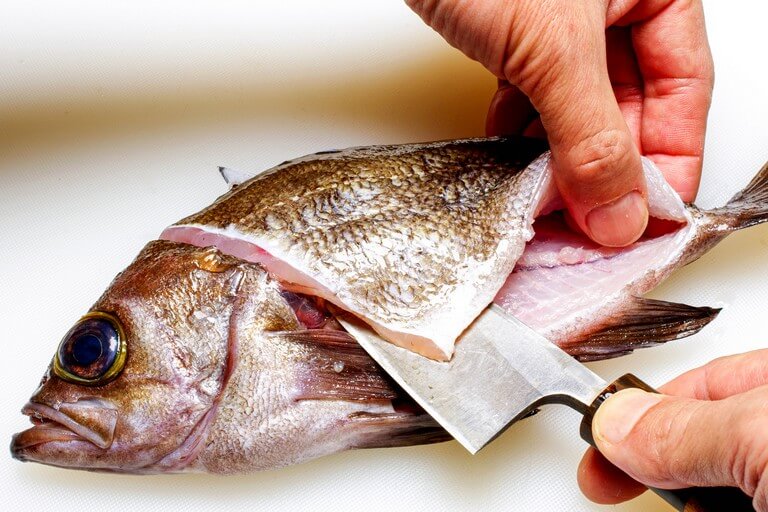 ウロコを落としたメバルを用意。尾頭付きの姿造り用にするので、まず頭と中骨を切り落とさず、胸ビレと腹ビレを結んでたすきに包丁を入れる。