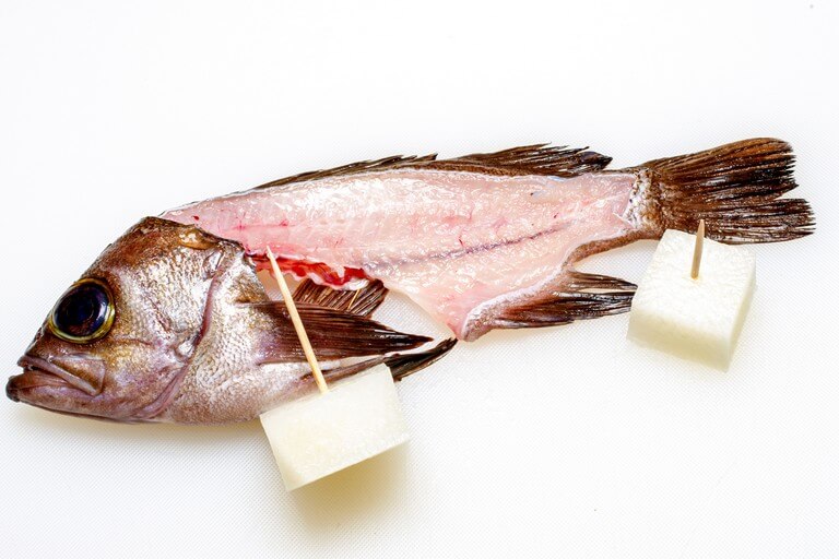 尾頭付きの中骨を立体的に盛り付けるには、大根やニンジンの小片に爪楊枝を刺した台座を2つ用意する。