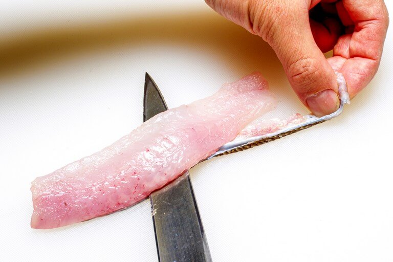 半身にした身は続いて腹骨をすき取り、骨抜きで血合骨を取り除いてから皮を引く。