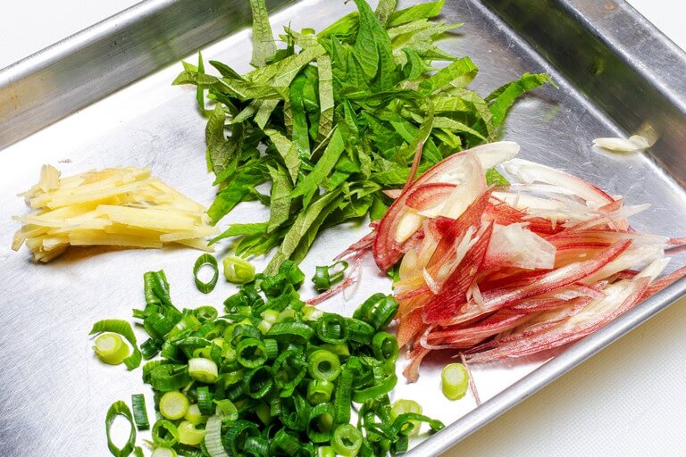 ・つま(大根の千切り、トサカノリ(赤トサカ、青トサカ)など適量)