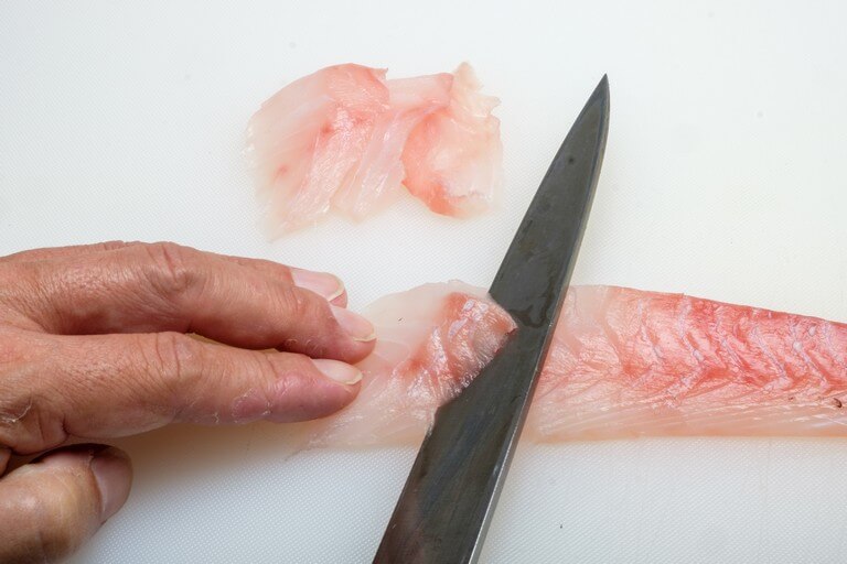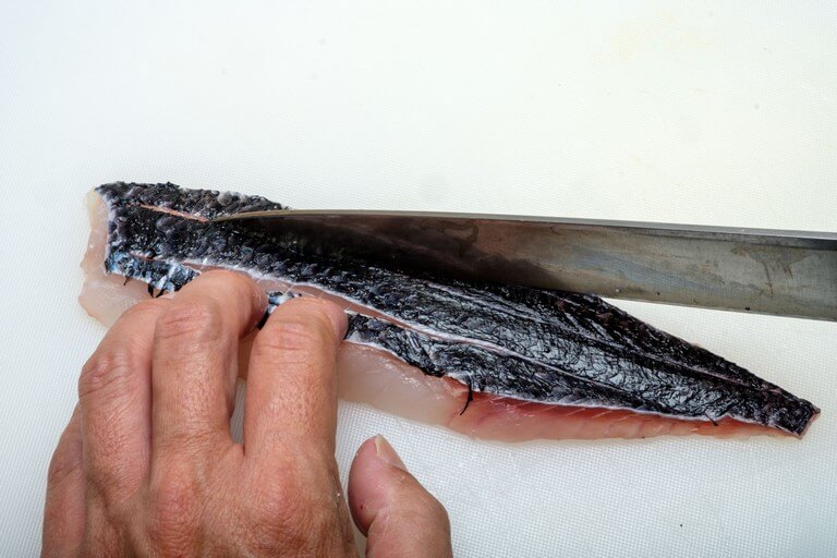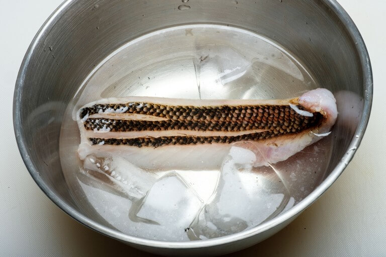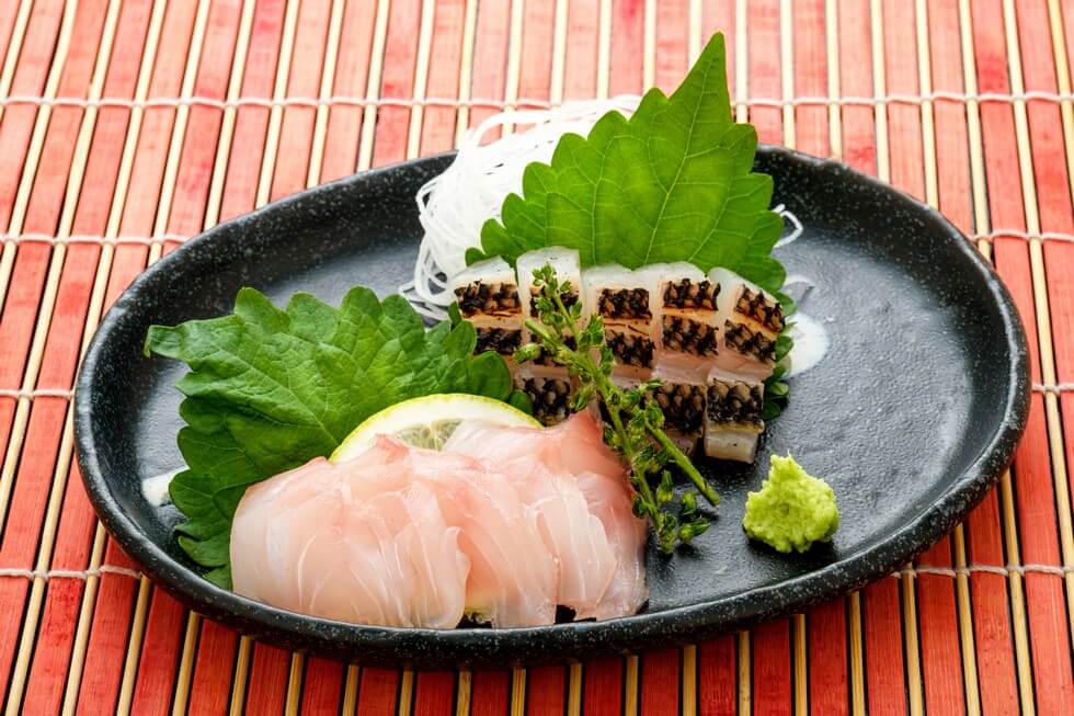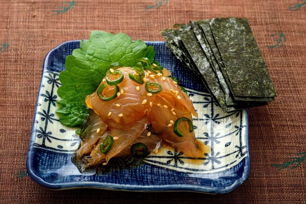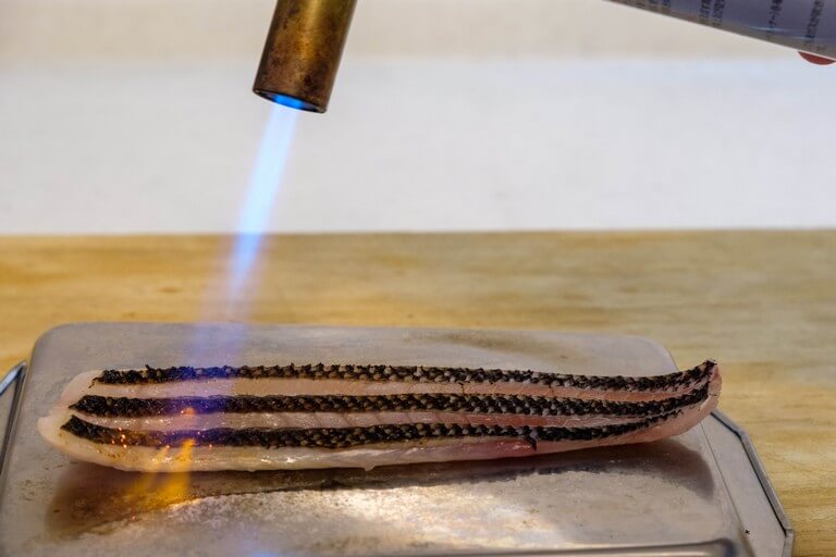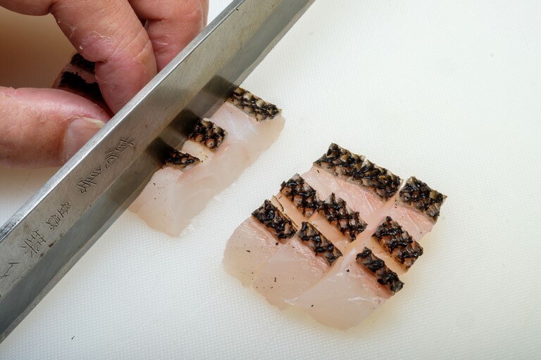 もっちりとして旨味もあるメジナは、皮も美味しい。バーナーを使う焼き霜造りは、中途半端に炙ると皮に硬さが残るので、意識してしっかり焼くのがコツ。