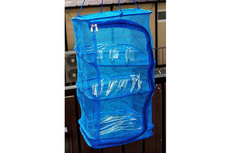 刺し身用などにさばいたあと、残った中骨を約8%の塩水に30〜40分浸し、ナイロン網製の干物器を使って3〜5時間天日干しにして水を抜く。写真はサヨリの干物と同時に中骨を干しているようす。