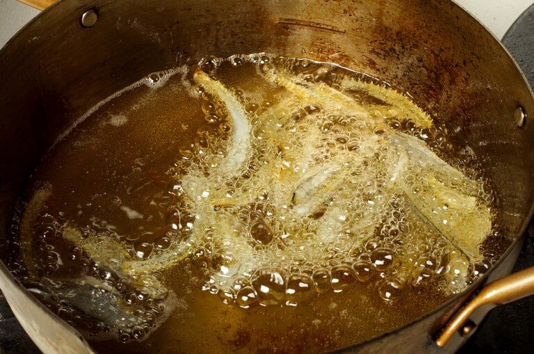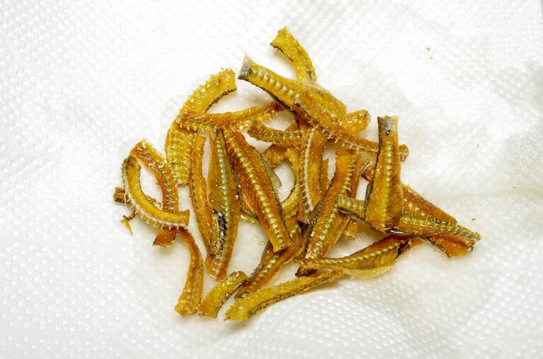 干し上がった中骨は6〜7cmに切り、165~170℃の中低温に熱した油で焦げないように注意しながら揚げる。