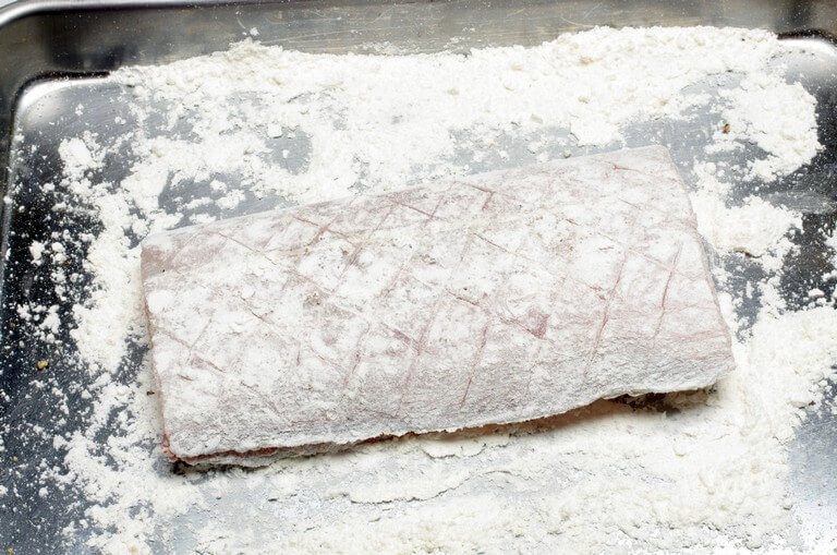 タチウオは小骨ごと背ビレを取り除き、筒切りにして、皮目に格子模様の飾り包丁を入れる。塩コショウをして、小麦粉をまぶす。