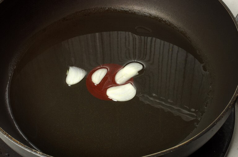 まずは、サラダ油大さじ2に、ニンニクの薄切りを入れ、弱火で香りを移して取り出す。