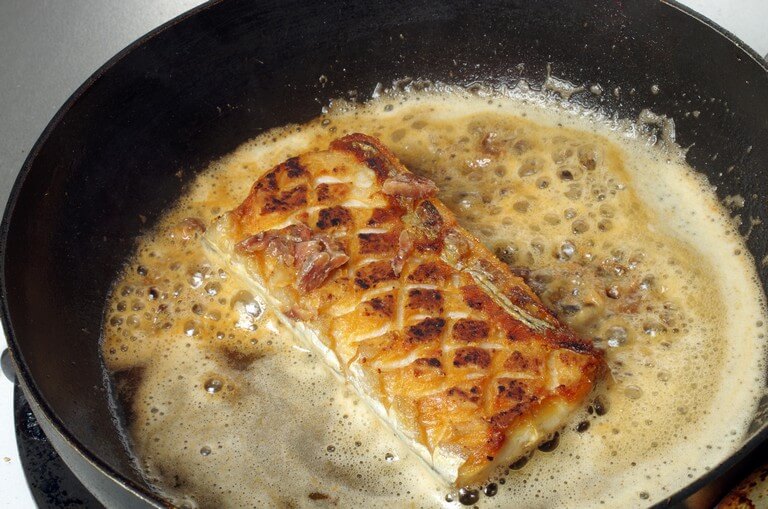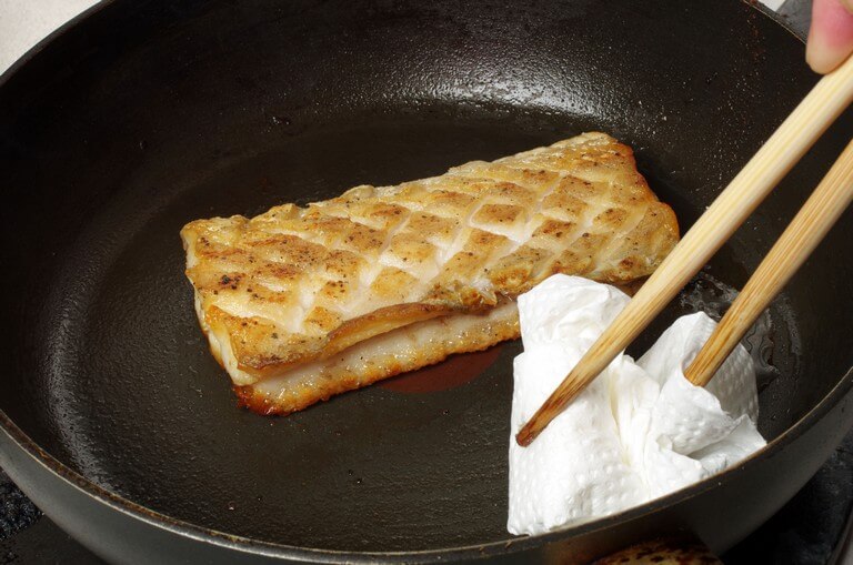 切り身を両面焼き、こんがりとした焼き目が付いたら、ペーパータオルなどで古い油をふき取ってしまう。