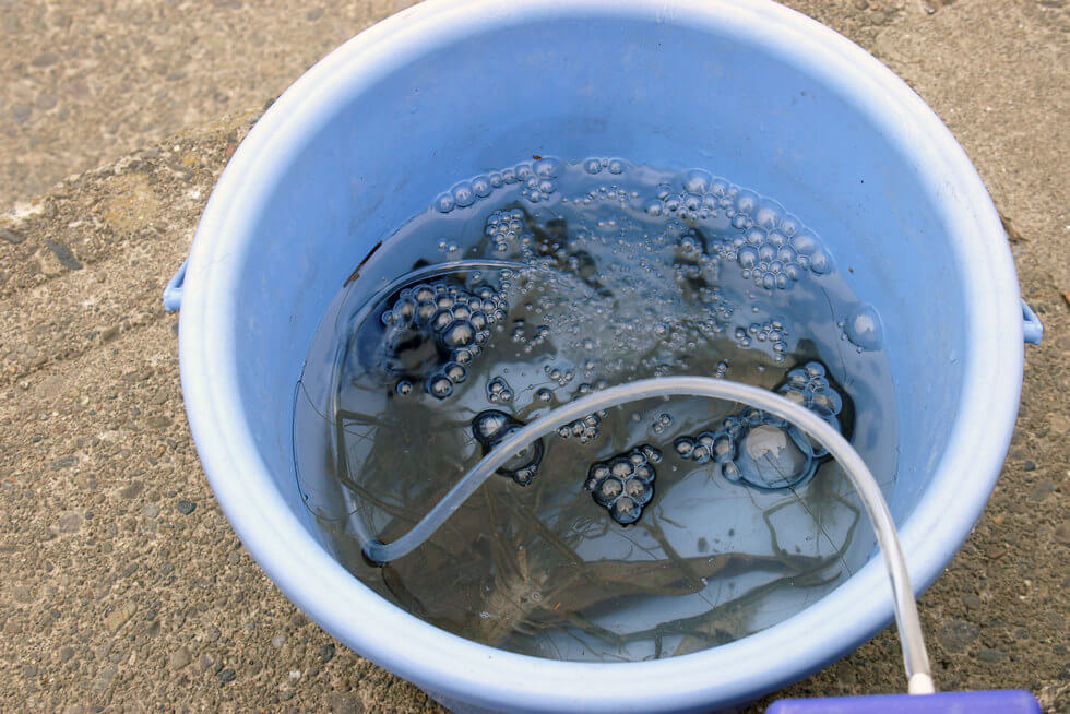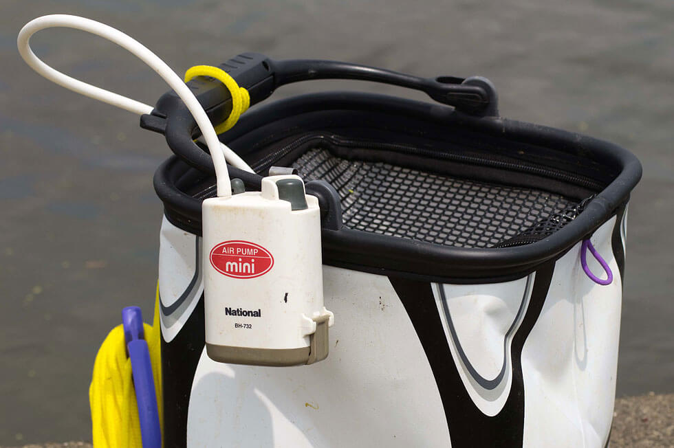 バケツは釣具店で販売しているフタ付きのものが使いやすい。エアポンプも取り付けやすくなっている。