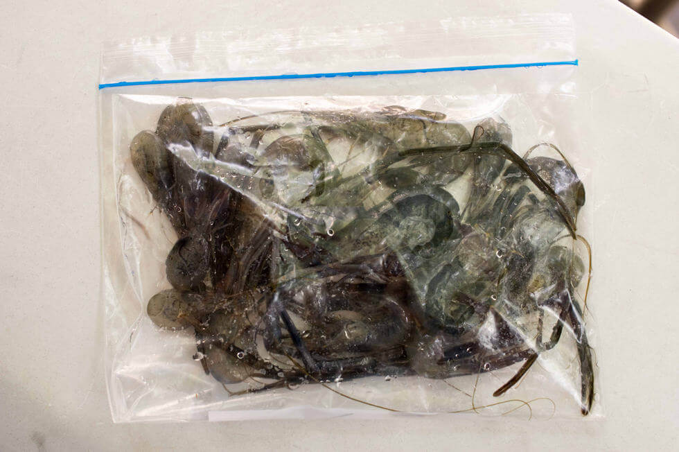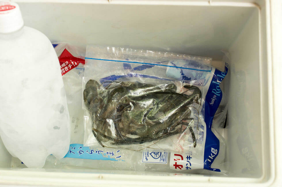 釣りを終えたら水を切り、まずジップバッグなどのビニール袋に収納する。テナガエビの体にある突起で破けることがあるので、気になる場合はビニール袋の上から手拭きタオルで包むとよい。
