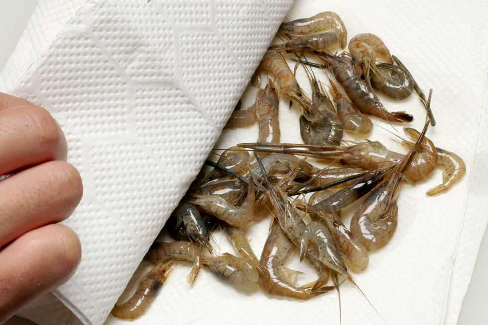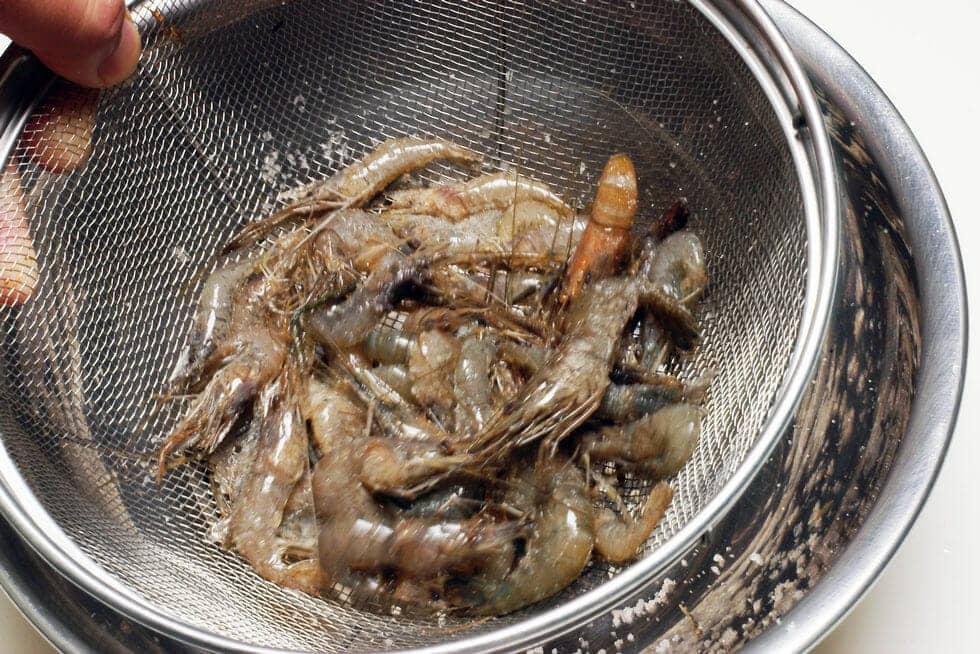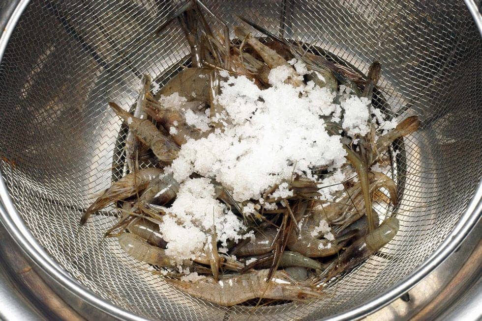 この時、テナガエビの突起でケガをしないようにザルの中で振るとよい。そのまま流水下で汚れと塩気をきれいに洗い流す。