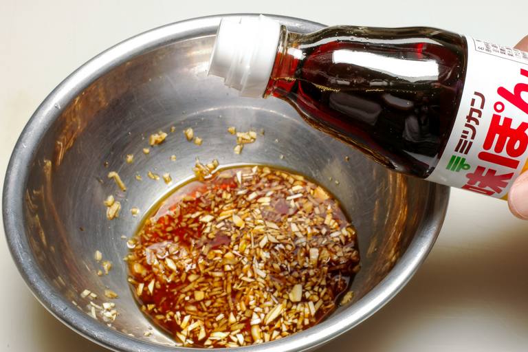 ポン酢だれをざっくりと合わせたら余分なたれ(汁)だけを捨て、残ったショウガとニンニクを絡ませる。器に盛って万能ネギの小口切りを散らす。ポン酢だれにいつまでも漬け込んでしまうと味が強過ぎるので注意したい。