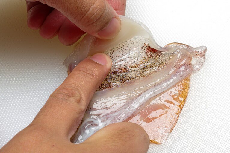 左右2枚あるエンペラの皮は外皮とエンペラの身の間を爪先で開き指先を差し込むと……