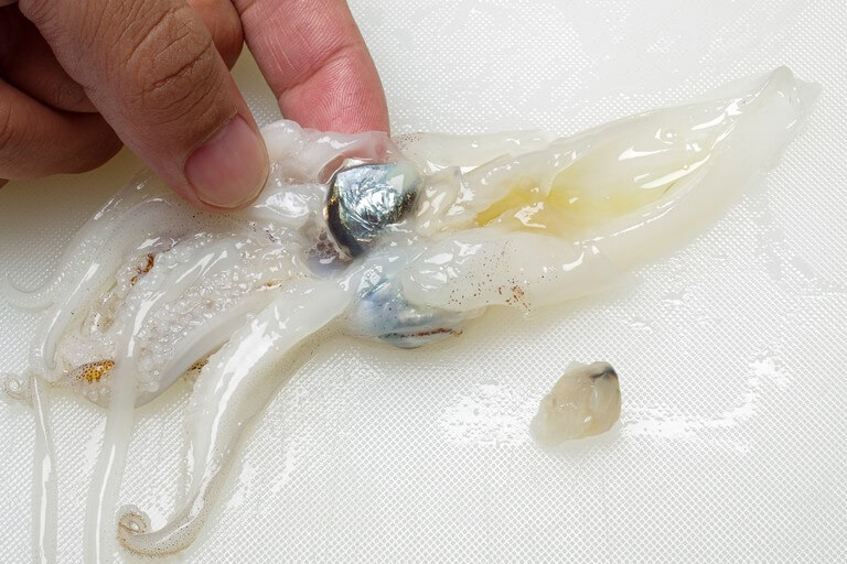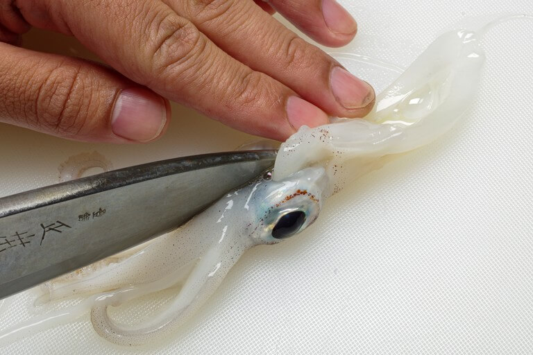 目玉とクチバシを取り除き、残っているキモなどを洗い流す。ゲソは2〜3本ずつ、頭もひと口大に切り分ける。