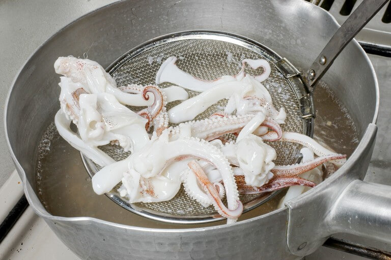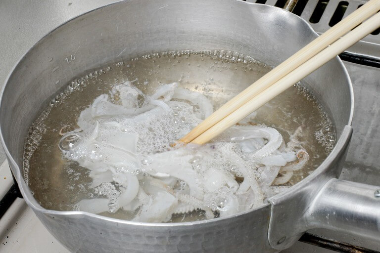 鍋にゆで湯を沸騰させエンペラとゲソを加える。