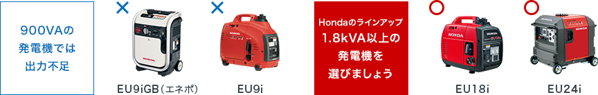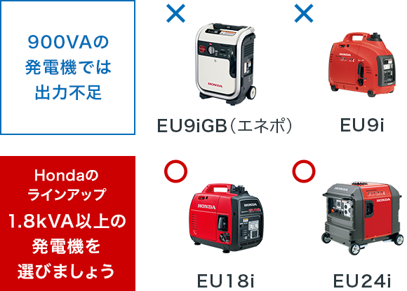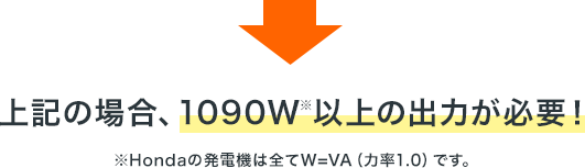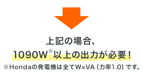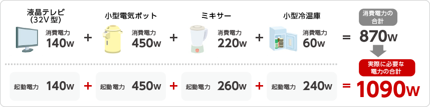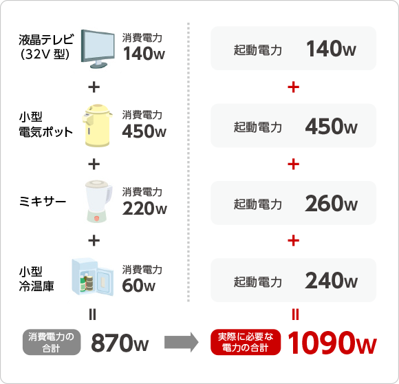 電気機器の消費電力と起動電力を基に、最適な発電機を選びましょう。