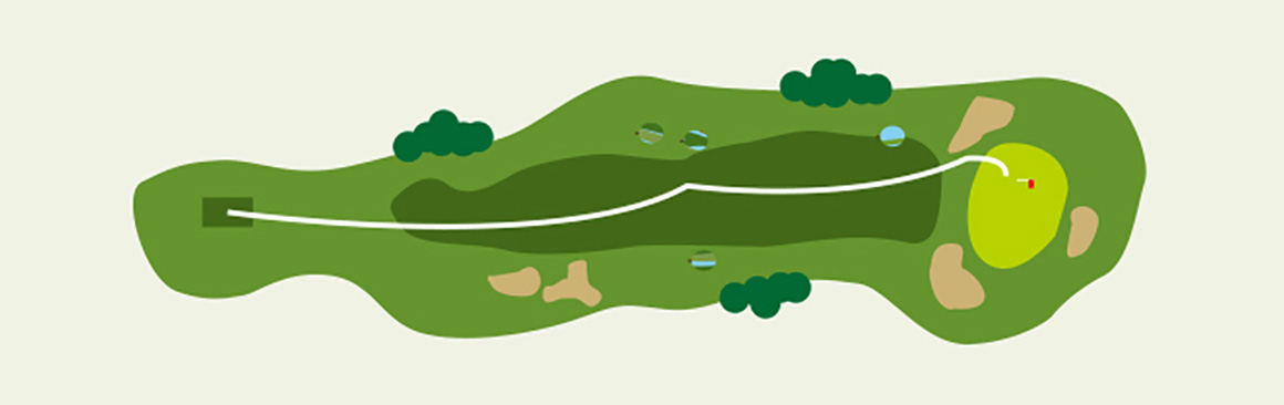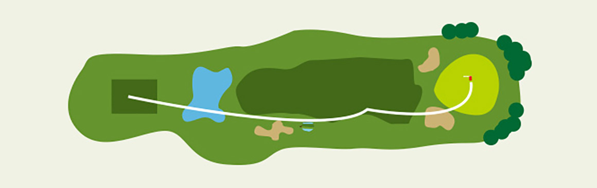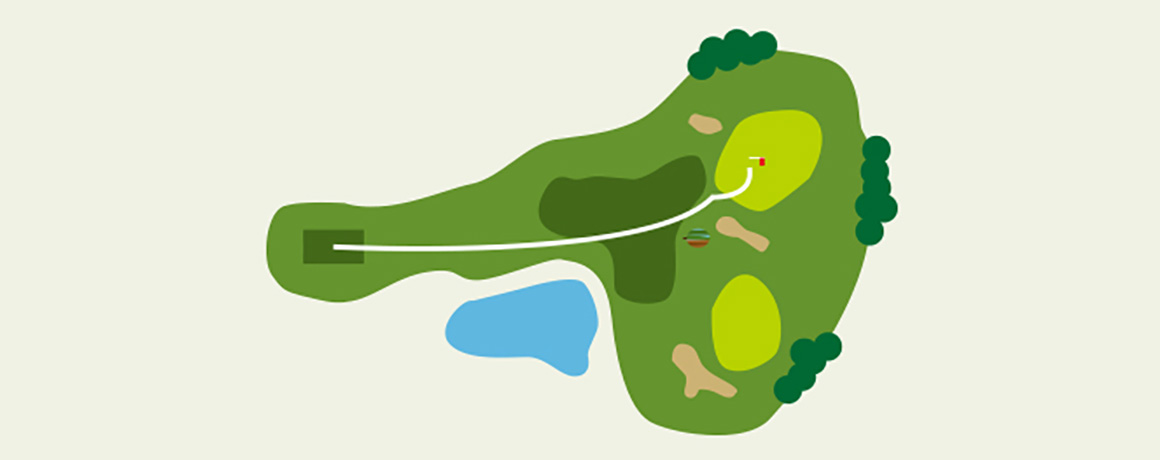 「これだけアップヒルだと、手前にショートすると下まで戻ってくる確率が高いので、ピン奥めはオッケーだと思って打ちましょう」とピッチングウェッジで大きめに打ちピン右奥5メートルにつける。 -