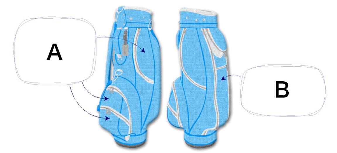 A:前側の小さいポケットにはグローブ・ボール・マーカー・ティ・グリーンフォークなど、プレイ中よく使うものと、その予備を入れると使い勝手がよい。