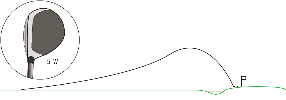 スピン量が多く弾道が高いので、落ちてからのランは少なめ。正しく打てればキャリーボールでバンカー超えのピンを狙える。