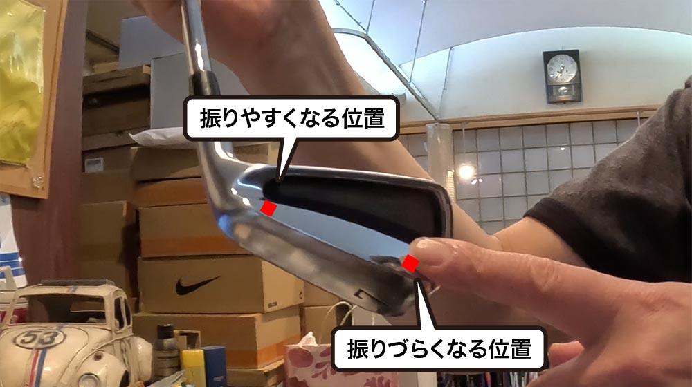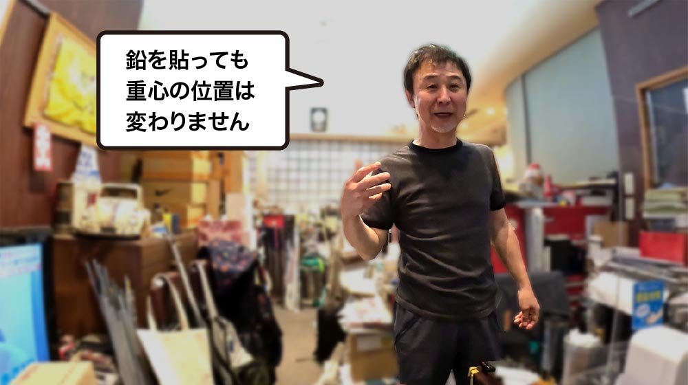 アマチュアは手の力で下ろすのでわからないかもしれませんが、プロはこのもたつきでちょうどいい感じに振り遅れます。すると「いい意味で振りにくくなった」というフィードバックが来るんです。これが鉛の効果で、「重心を動かす」とか「バランスを変える」ということではありません。0.5グラムから1グラムの中で球筋をコントロールするのが一番効率の良い鉛の貼り方です。