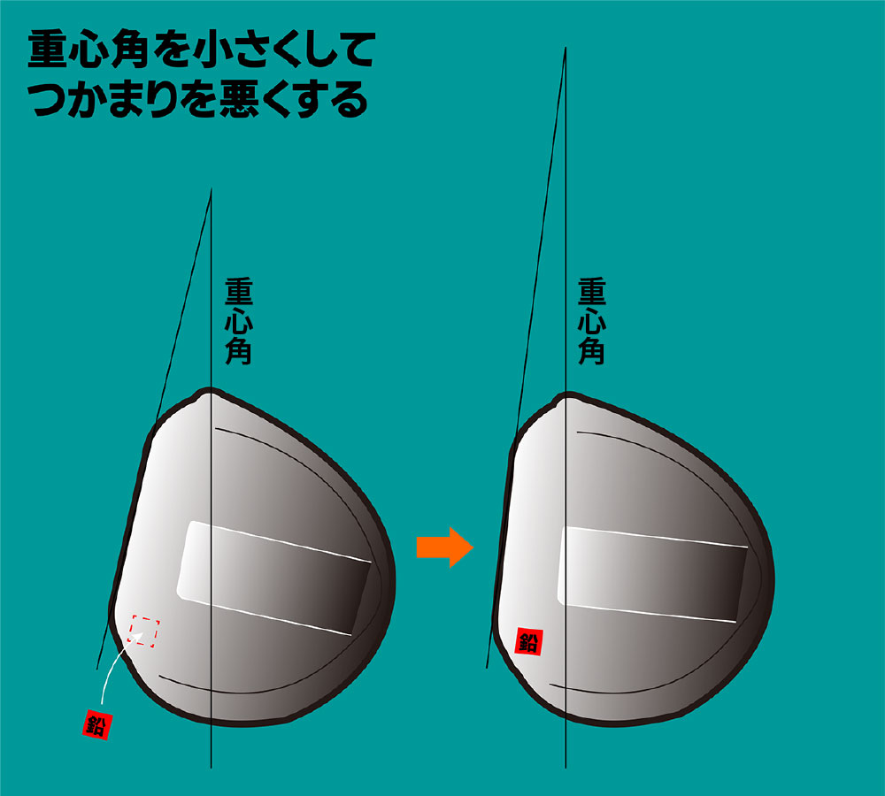 宮城 要はフェースをかぶせたいのか、それとも開きたいのか、ということです。重心角に対してシャフト軸から垂直に引いた線が基準となって、線よりもフェース寄りに鉛を貼ればアングル(角度)は小さくなって開き傾向になります。逆に線よりも後方に貼るとアングルは大きくなり、つかまりが良くなるということですね。