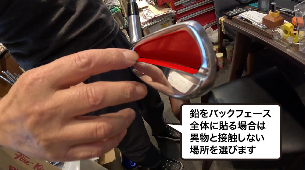 宮城 あれは重さが足りないときに貼るんです。シャフトの中で加重してバランスを上げるのではなく、「外鉛で」という指定があるときにああいう貼り方をするんです。この場合は全体的に張ったほうがいいので、当たらない部分、たとえばキャビティ部分の形に合わせてカットして貼ったりしていました。
