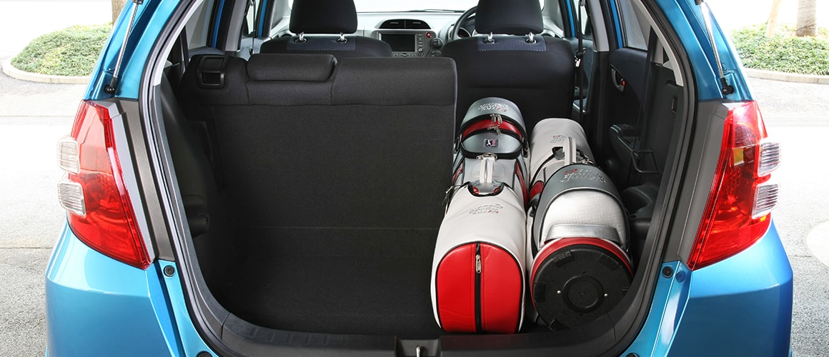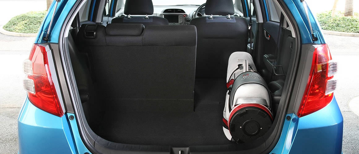 6:4分割可倒式のリアシート右側を倒し、そこに1個目のバッグをヘッド側から縦方向に載せます。