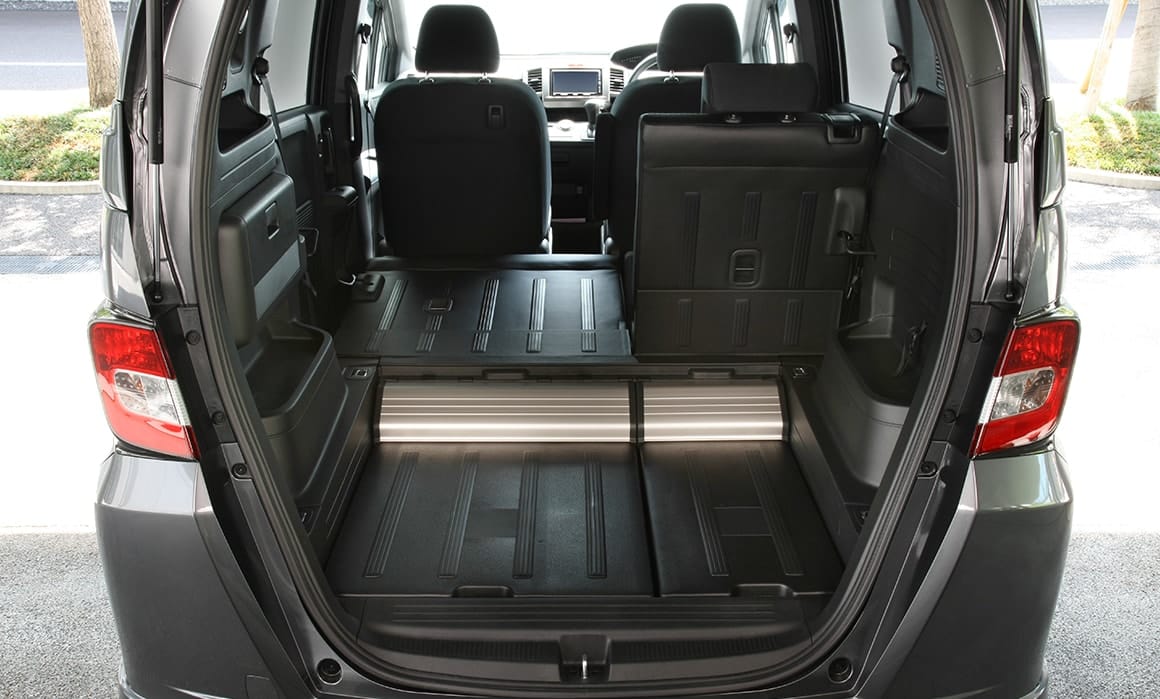 フリード スパイクならではの新発想、反転フロアボードを裏返すことで、フロアを低くし、より十分な後方視界を確保。