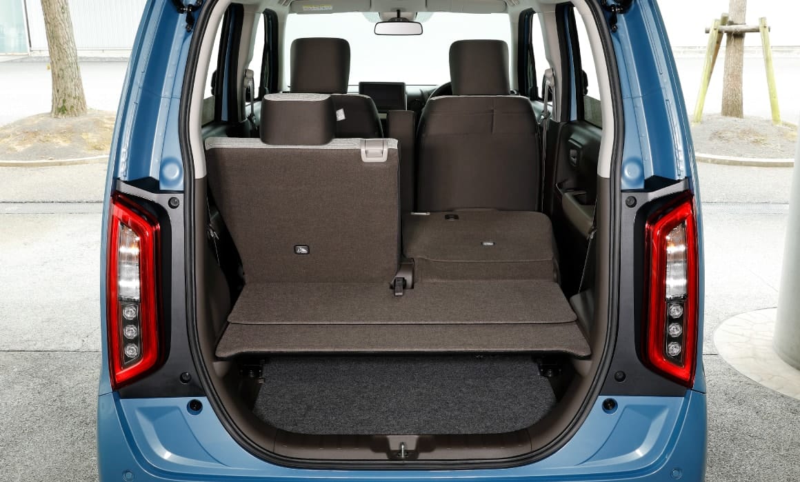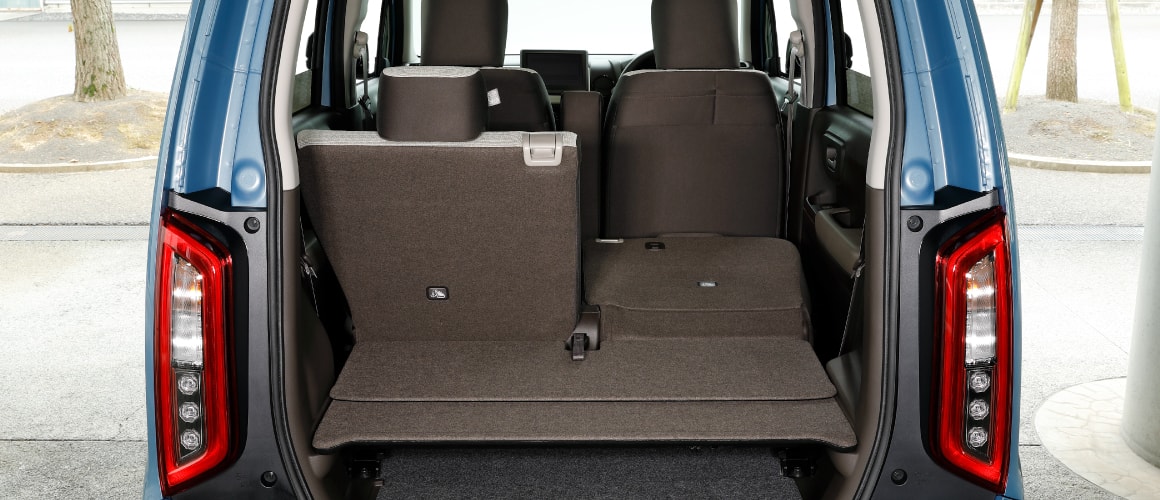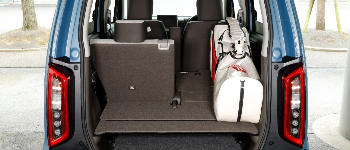 後席の肩口のレバーを引いて、右側の背もたれを倒します。さらにゴルフバッグをより安定して載せられるよう、後席を前へスライドさせてスペースを広げておきます。