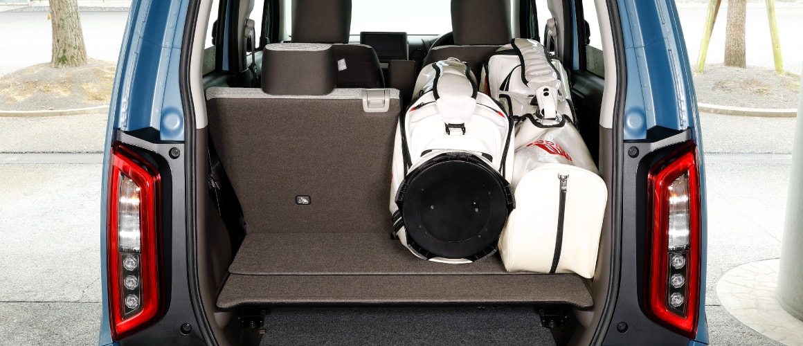 低く、広い荷室は、備え付けのボードを使って2段ラックモードにアレンジ可能。上段にゴルフバッグ、下段にはボストンバッグやシューズケースと、すっきり積み分けできます。仕切りの高さもちょうどよく、バッグの出し入れはスムーズです。