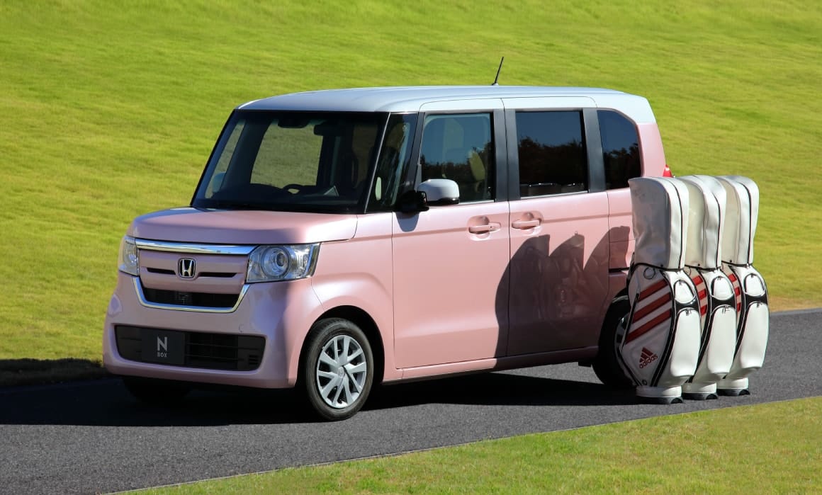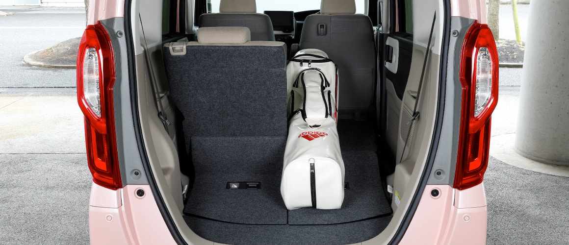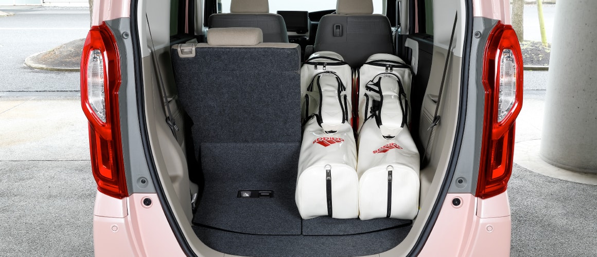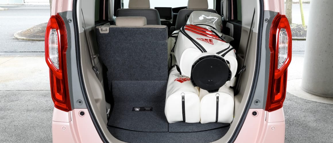 軽自動車として画期的に広い空間は、ゴルフバッグ3個と、ボストンバッグやシューズケースなどを余裕で収納。開口部が低いので、積み下ろしもラクラクです。